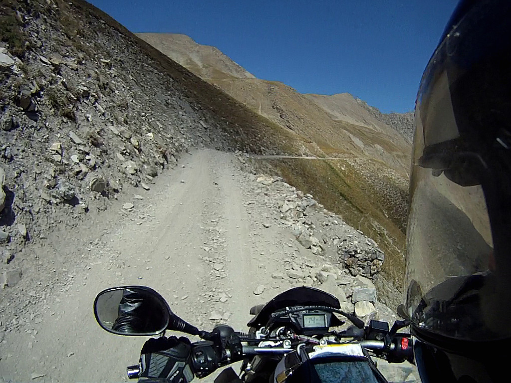 Neben der Fahrbahn geht es nicht im 90 Grad Winkel hinunter, aber irgendwo bei 80 Grad dürften wir angekommen sein. Das Bild wurde auf dem letzten Kilometer aufgenommen, hinter der nächsten Kehre sind Tunneleinfahrt und die freie Fläche davor bereits in Sicht.