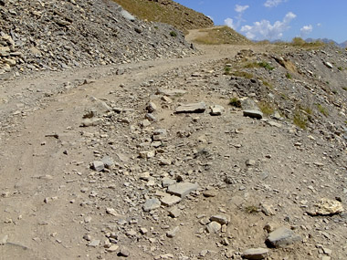 Je höher man kommt, umso ruppiger wird der Belag. Viele lose Steine und ausgewaschene Bereiche gestalten die Fahrt interessant, während die Spur immer schmaler und der Abhang immer steiler wird.