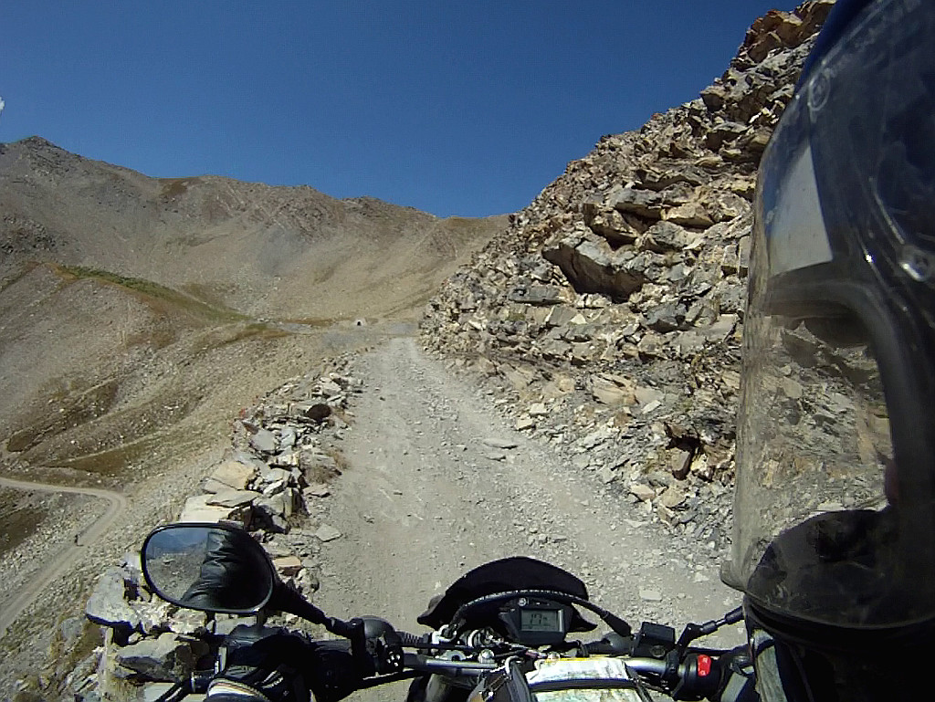 Die letzten paar hundert Meter, das schwarze Loch der Tunneleinfahrt ist bereits in Sichtweite. Links neben der Straße geht es nun mit 85 Grad Gefälle den Berg hinab. Links unten ist ein Mountainbiker zu sehen, der sich ebenfalls die Flamme Rouge hocharbeitet.