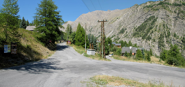 4,7 Kilometer hinter dem Talort muss in einer engen Linkskehre rechts abgebogen werden. Hier von von oben kommend fotografiert, da ich zuerst vorbeigefahren bin. Links am Straßenrand steht eine hölzerne Infotafel, die als Wegmarkierung dienen kann.