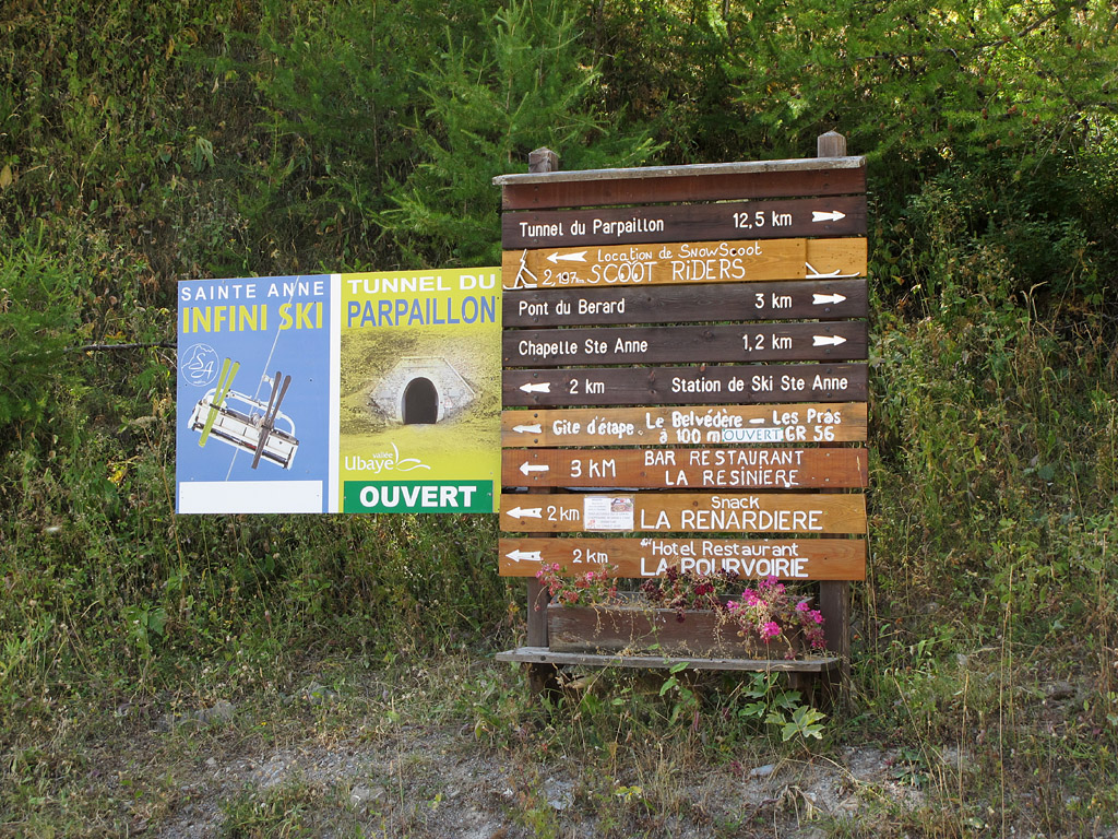 Dieses Holzschild steht an der Hauptstraße neben der Abzweigung, die hoch zum Tunnel gefahren werden muss. Eigentlich sollte es groß und auffällig genug sein, trotzdem bin ich vorbeigefahren.
