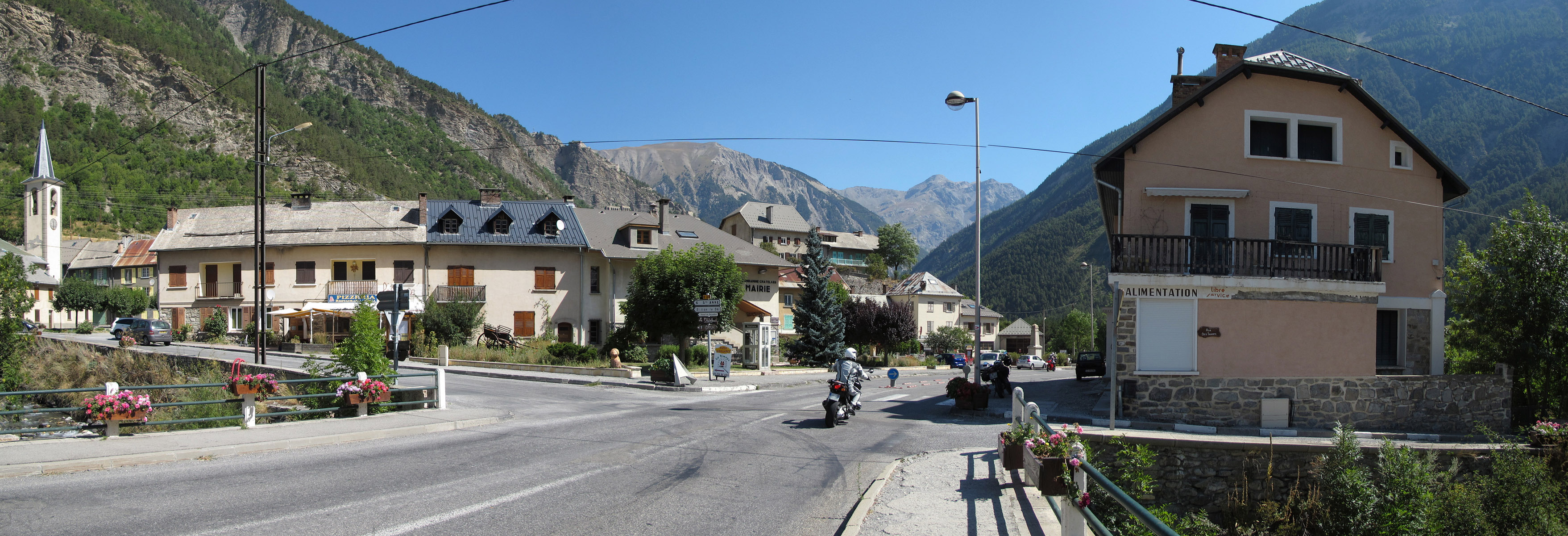 Die Einfahrt im Ort La Condamine Châtelard war im Jahr 2012 nicht für beide Richtungen ausgeschildert, da muss aus Norden kommend ein wenig aufgepasst werden. Die bläuliche Tanne hinter dem Biker ist auch aus den Kehren oberhalb des Ortes gut zu erkennen.