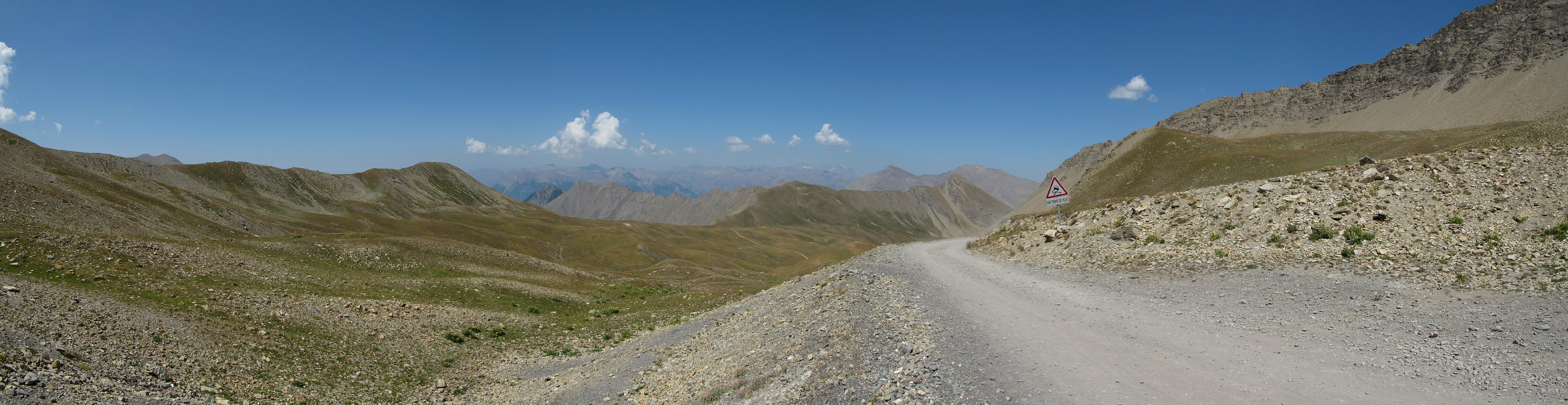 Die Westrampe ist genauso kahl wie ihr östliches Gegenstück, aber wegen der einfacheren Piste wirkt sie gleich viel ziviler und weniger bedrohlich. Aufgenommen wurde das Bild gleich von der Passhöhe aus.