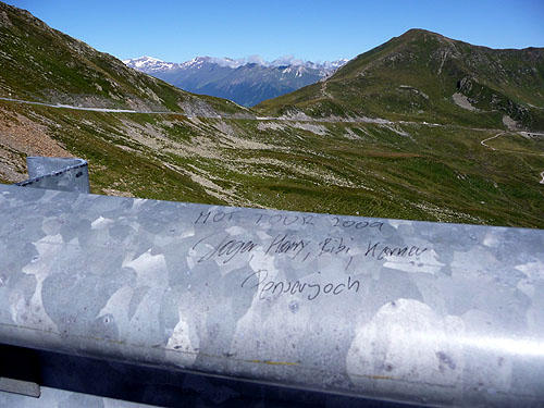 Schmierereien wo man hin sieht, hier ist die Leitplanke an der Penser Joch Passhöhe die Leittragende.
