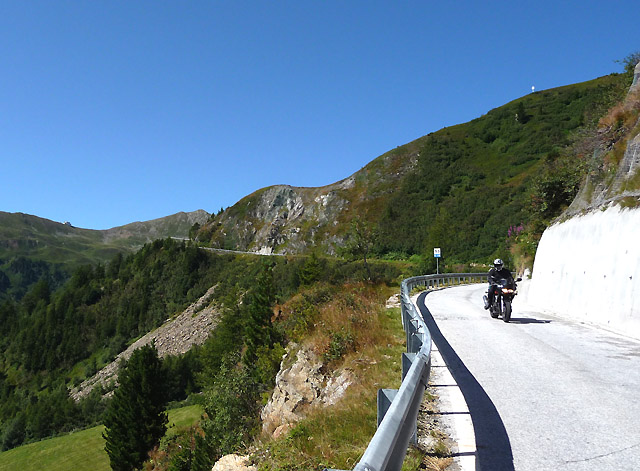 Im oberen Drittel der Nordrampe hat man die Passhöhe für lange Zeit im Blick. Sie ist oben links im Bild zu erkennen, das Hotel Alpenrosenhof steht fast genau in der Kerbe zwischen zwei Berggipfeln.