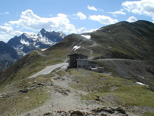 Die Penser Joch Passhöhe, aufgenommen von einem kleinen Aussichtspunkt, der sich oberhalb des Hotels Alpenrosenhof befindet. Dort steht eine kleine Bank, und die Aussicht in fast alle Richtungen ist gegeben.