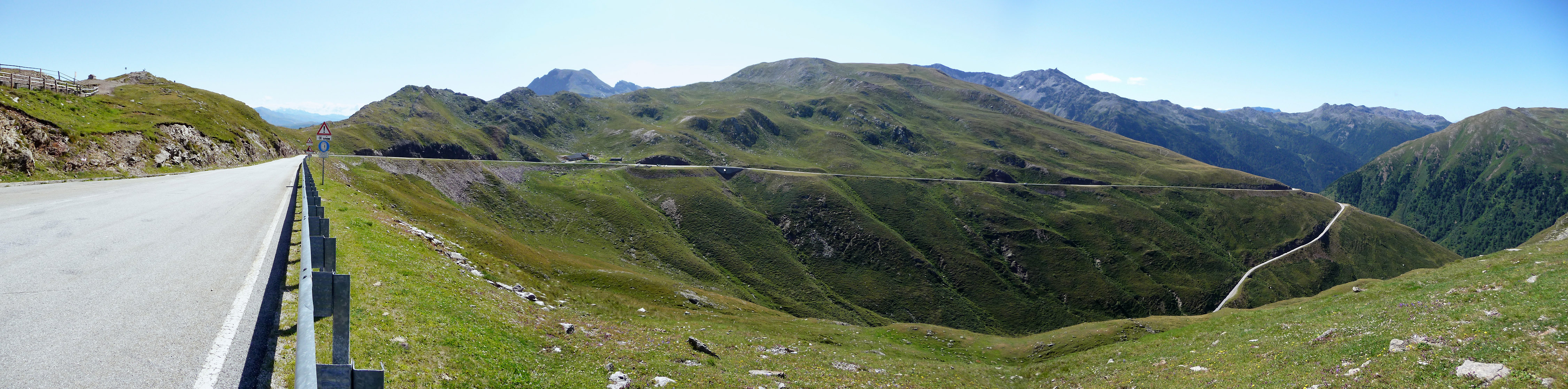 Die obersten Meter der Penser-Südrampe, aufgenommen von der Passhöhe. Das Hotel Alpenrosenhof befindet sich links außerhalb des Bildes, die kleine Parkbank oberhalb des Hotels ist am linken Bildrand noch zu erkennen.