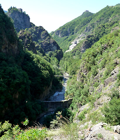 Einblick in die Schlucht. Diesen Anblick bekommt man, wenn man sich (nach Süden bergab fahrend) vor dem 2. Tunnel links an die Leitplanke setzt. Von der Position ist auch das breite Panoramabild erstellt worden.