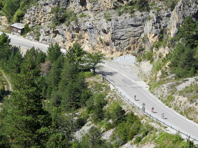 Aus den Kehren heraus kann an manchen Stellen tief hinunter ins Tal geschaut werden. Bei dem Abstand sahen die Radler wie drei sich kaum bewegende Punkte aus. Péone befindet sich links außerhalb des Bildes, rund einen Fahrkilometer von der fotografierten Stelle entfernt.
