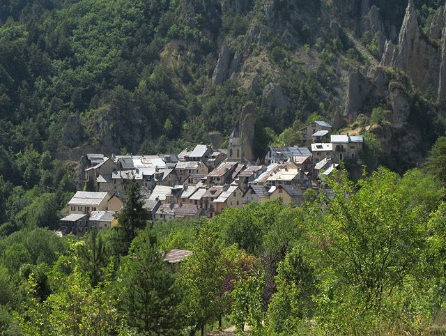 Aus viel mehr als den Häusern besteht Péone nicht. Hier fotografiert aus dem Stück heraus, das sich zwischen den Kehren und dem Ort befindet, kaum einen Kilometer bevor man ihn erreicht hat.
