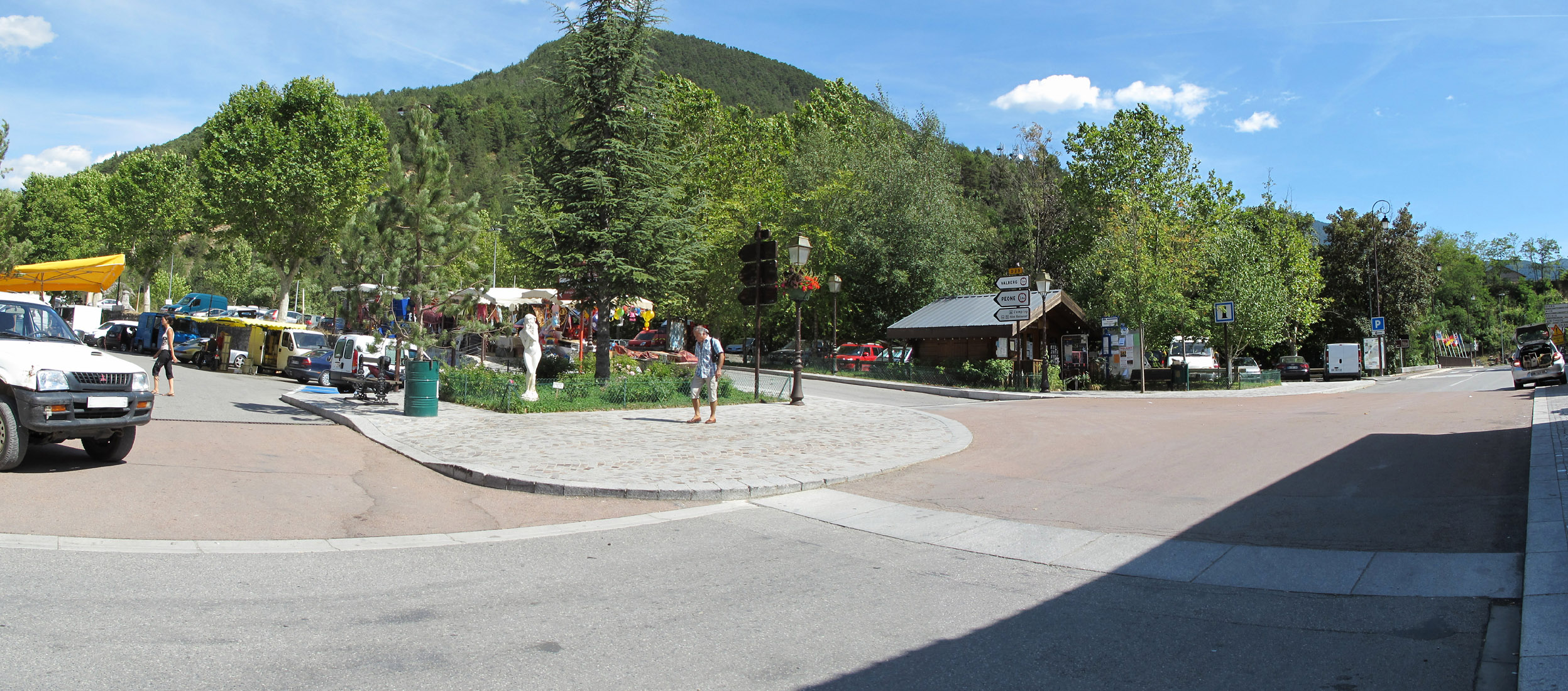 Im Talort Guillaumes sind Péone und Valberg gut ausgeschildert. Rechts geht es nach 30 Metern über eine Brücke und weiter nach Süden zur Gorges de Daluis(i), links fand bei meinem Besuch gerade ein Markt auf den Parkreihen statt.
