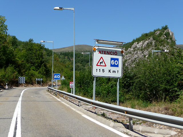 Aus Osten kommen, geht es bis zu diesem Schild im Höchsttempo nach oben, aber wer dann erst hinter dem Schild damit anfängt, Geschwindigkeit herauszunehmen, kommt vielleicht nie am Puerto de Perves an.