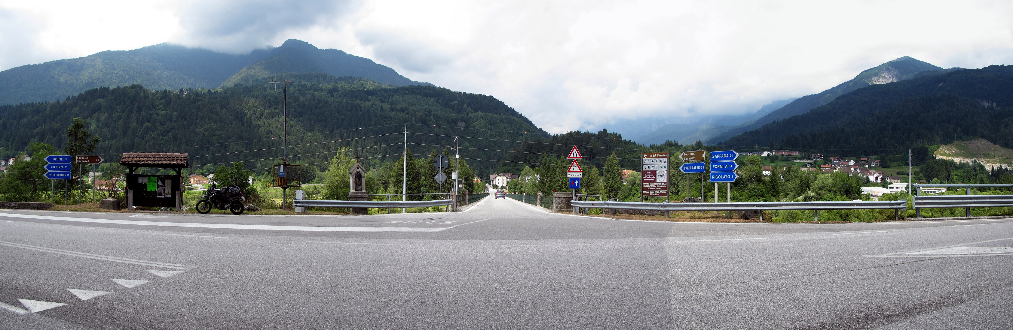 Die östliche Einfahrt ins Val Pesarina ist gut ausgeschildert. Gerade aus geht es in dieses, als erstes über eine Brücke, nach links (Süden) ist der berüchtigte Monte Zoncolan nicht weit entfernt.