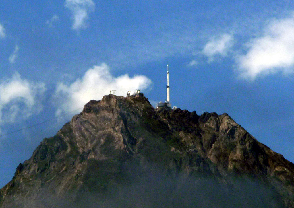 Die Teleskopanlage auf dem Pic du Midi de Bigorre ist aus dem waldigen Mittelteil der Tourmalet-Ostrampe hin und wieder zu sehen. Am Tag meiner Überquerung 2009 war es etwas bewölkt, das Orignalbild musste stark bearbeitet werden.