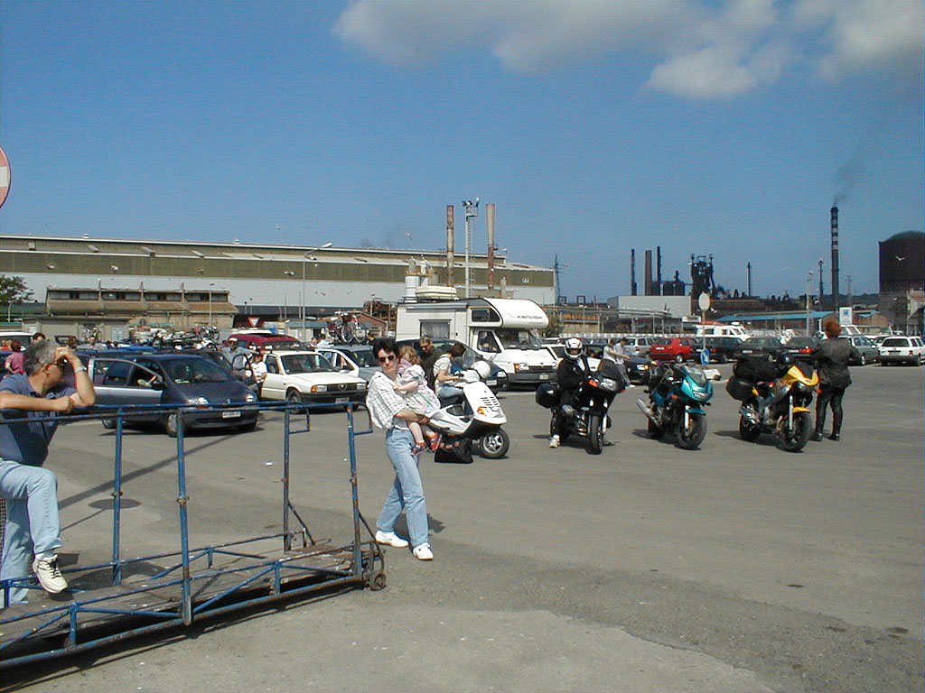 In der Wartezone des Hafens in Piombino werden die Motorräder vorne eingereiht. Sie kommen als erstes in die Fähre und werden an den Seitenwänden festgezurrt. Die Fähre macht rechts außerhalb des Bildes fest.