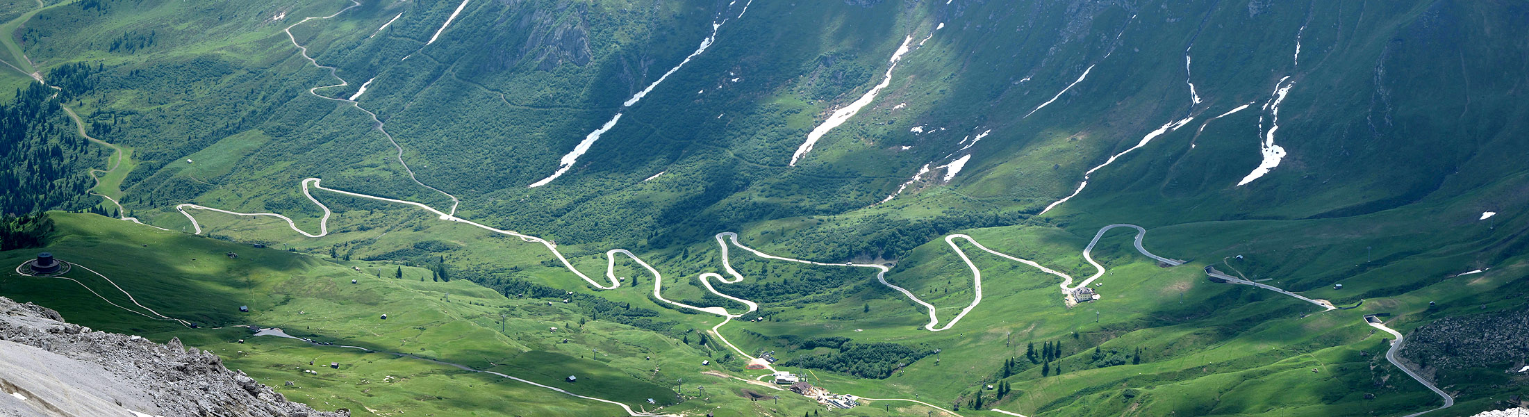 Der obere Teil der Passo Pordoi-Ostrampe ist mit am Besten aus der luftigen Höhe des Sass Pordoi einzusehen, der von der Pordoi-Passhöhe aus per Gondel zu erreichen ist. Diese befindet sich rechts ganz knapp außerhalb des Bildes, links geht es ins Tal nach Arabba. Mit im Bild ist auch das Risto Lezuo, es ist im rechten Drittel des Bildes als einzelnes Gebäude an einer Kehre zu finden.