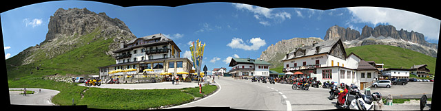 Blick auf den östlichsten Teil der Pordoi-Passhöhe. Links das Hotel Savoia, rechts das Ristorante Maria, zwischen den beiden geht es ins Zentrum der Passhöhe und auf die Westrampe.