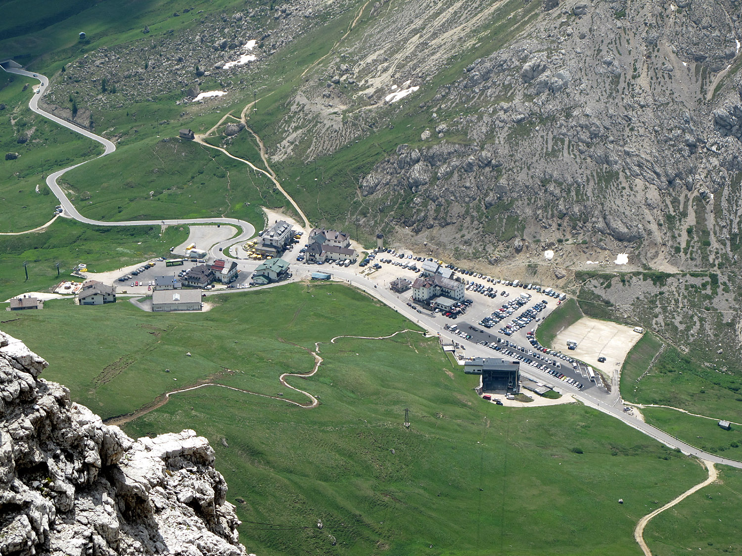 Blick auf die komplette Passhöhe des Passo Pordoi, aufgenommen vom westlichen Teil der Aussichtplattform, die sich in 2.900 Metern Höhe auf dem Sass Pordoi befindet. Links ist noch ein Stück der Pordoi-Ostrampe zu sehen, rechts geht es auf die Westrampe.