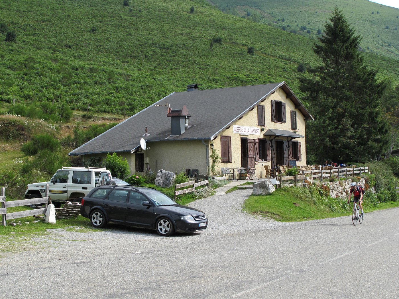 Die Auberge de la Sapinière liegt nur wenige Meter unterhalb der Passhöhe. Sie bietet zwei Unterkünfte, die sich hinter dem Haupthaus befinden und nicht im Bild zu sehen sind. Verpflegung wird ebenfalls geboten, auf der Terrasse kann von kleinen Snacks bis zur kompletten Mahlzeit alles bestellt werden.