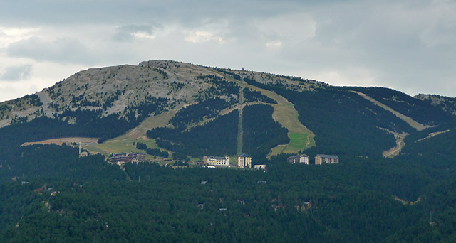 Im mittleren Bereich der Südrampe gibt es eine Stelle, von der aus man einen schönen Blick auf den höhergelegenen Skiort Port del Compte werfen kann. Dies ist eine Zoom-Aufnahme, aus der mehrere Kilometer Dunst herausgerechnet werden mussten.