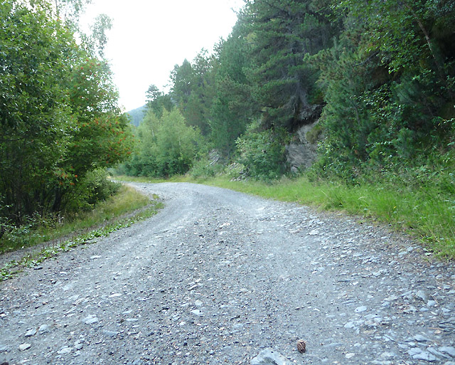 Zwischen einem zweispurigen Teilstück und einem steilen und sehr ausgewaschenen Gefälle runter zu einer kleinen Brücke ist der Belag für ein kurzes Stück gemütlich zu fahren.