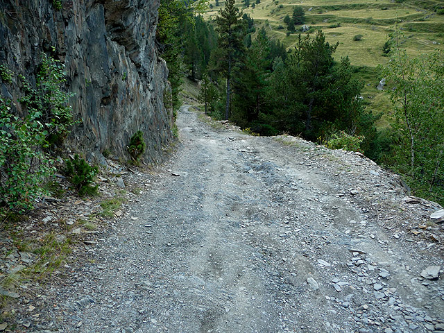 Diese steile Stelle befindet sich kurz vor der Brücke, an dem die beiden Wege der Westrampe wieder zusammen finden. Die Brücke wird von den dunkelen Tannen verdeckt. Der Belag ist an dieser Stelle extrem ausgewaschen, was zusammen mit dem starken Gefälle besonders viel Konzentration erfordert.