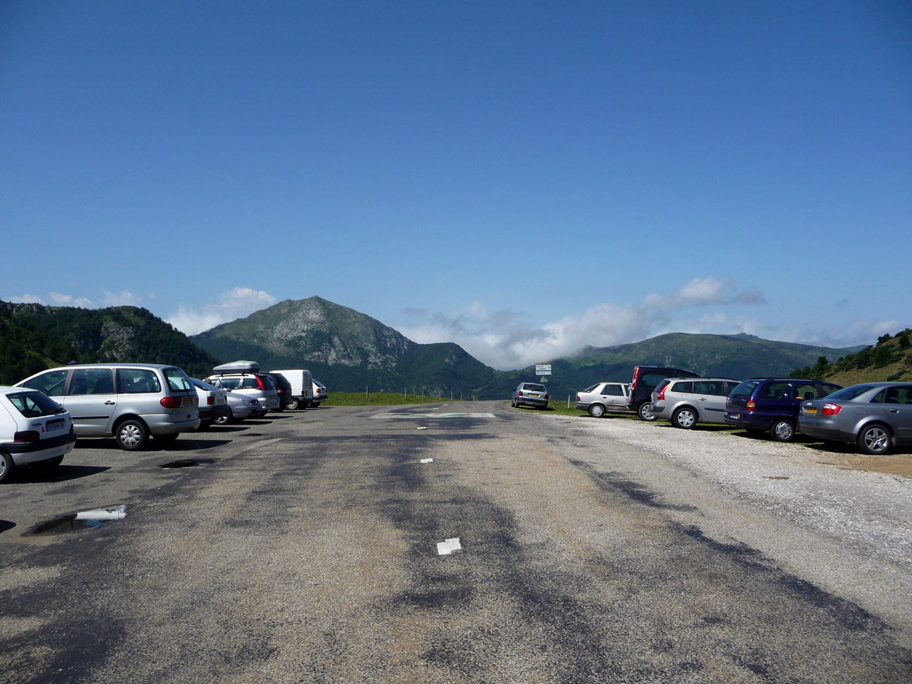 Zwei großzügige Parkreihen zieren die Lers-Passhöhe. Der Blick geht nach Westen.