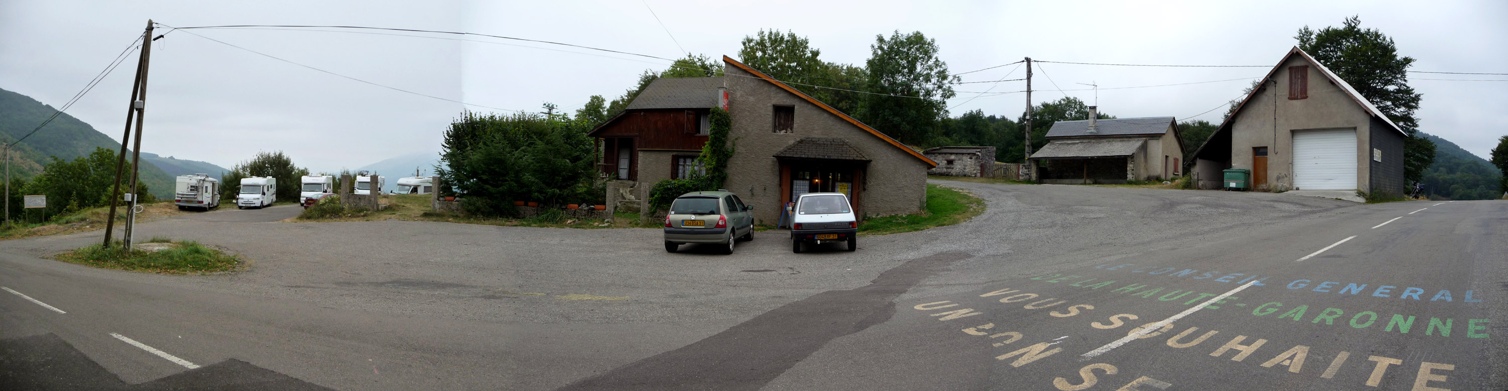 Kleines Panorama der Portet d'Aspet(i)-Passhöhe, zusammengestellt aus 3 Einzelaufnahmen. Rechts geht es nach Westen und zum Col de Menté(i), links auf die Ostrampe des Portet.