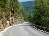 Es gibt zwar auch engere Kurven und Kehren, besonders positiv sind mir aber die vielen Links-Rechts-Links-Kombinationen aufgefallen, in denen man die Maschine mit nur kurzen Lenkbewegungen in die richtige Richtung werfen kann. Auf einer Straßenseite verläuft die meiste Zeit eine bröckelige Felswand, auf der anderen Seite der dicht bewachsene Abhang.