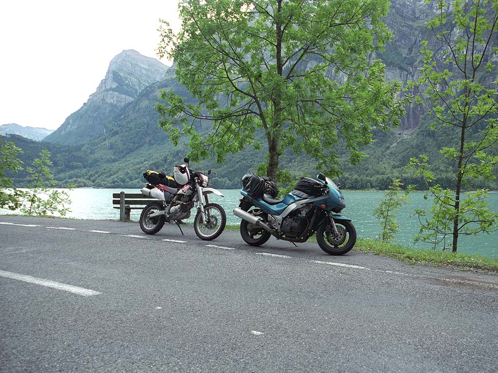 Am Ufer des Klöntaler Sees, der sich auf der Ostseite des Pragelpass befindet, gibt es alle paarhundert Meter eine Raststelle. Die Meisten sind nicht besonders groß, das ein oder andere Motorrad hat aber überall Platz.
