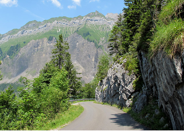 Ist man hinten an der Kurve angekommen, kann es durchaus passieren, das nur wenige Meter voraus ein entgegenkommendes Auto auftaucht. Wegen der Felswand rechts wäre dieses erst sehr spät zu sehen.