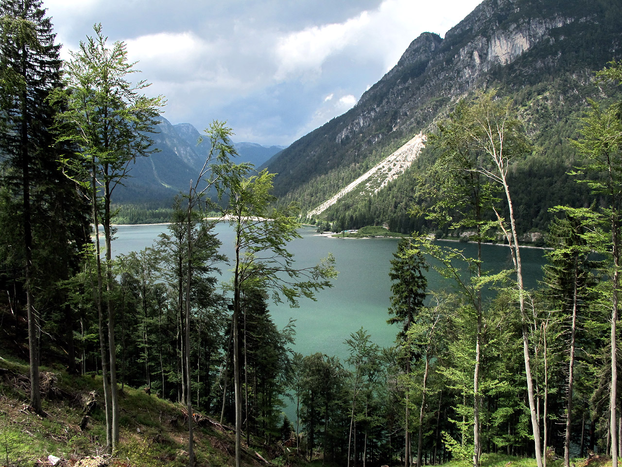 Blick auf den Predilsee (Lago del Predil), aufgenommen von der Nordrampe des Passo Predil. Hinter dem See liegt die Ostrampe des Passo Nevea(i), die etwas links der Bildmitte weiter zu dessen Passhöhe führt.