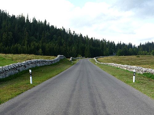 Col du Marchairuz wird die Straße längere Zeit von einem hüfthohen Mäuerchen begleitet.