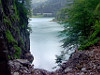 Am Straßenrand noch immer dicht bewachsen, ist der Blick ins Tal eher selten frei. Mir sind nur zwei Stellen aufgefallen, in denen die Lücke zwischen den Bäumen breit genug für ungehinderte Aussicht war. Diese sollte man nutzen, denn es geht ziemlich weit hinunter. Mindestens einmal kann sogar die Straße gesehen werden, die sehr schräg unten durch das Val Lumiei führt.