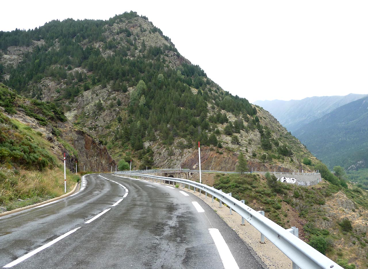 Im Bild sind gut die Straßenschäden auf der Südrampe zu sehen. Wie ruppige Längsrillen ziehen sie sich über weite Distanzen, besonders bei nasser Strecke äußerst nett zu fahren.
