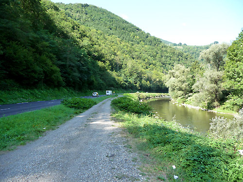 Gorges de Ribaouto. Sie sollte eigentlich auch eine Schlucht sein, macht aber mehr den Eindruck einer überall-grünen Taldurchfahrt. Westlich liegt der