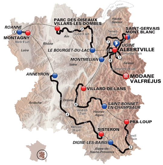 Dauphiné. Etwas unrund startet und endet sie an einem Dienstag, 7. Juni und 14. Juni, insgesamt sind es 8 Etappen ohne Ruhetag, die gegen den Uhrzeigersinn durch die