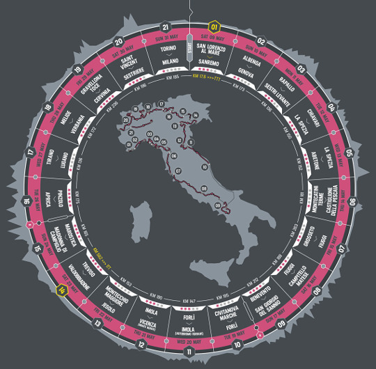 Giro d'Italia beginnt dieses Jahr am Samstag den 9. Mai und endet Sonntag den 31. Mai nach 20 Etappen und 2 Ruhetagen. Er beginnt an der ligurischen Küste nahe