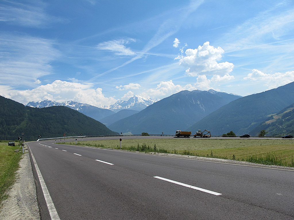 Eine der sehr langgezogenen Kehren im unteren Teil der Südrampe. Im Bild ist ein LKW zu erkennen, der eine ganze Kolonne Autos hinter sich herzog. Ein Anblick den man am Reschenpass desöfteren zu Gesicht bekommt.
