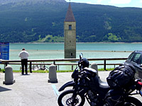 Hinter dem Ort führt die Straße für 10 Kilometer am schön anzuschauenden Reschensee vorbei, die Straße ist auf langen Strecken nicht weit vom Wasser entfernt.