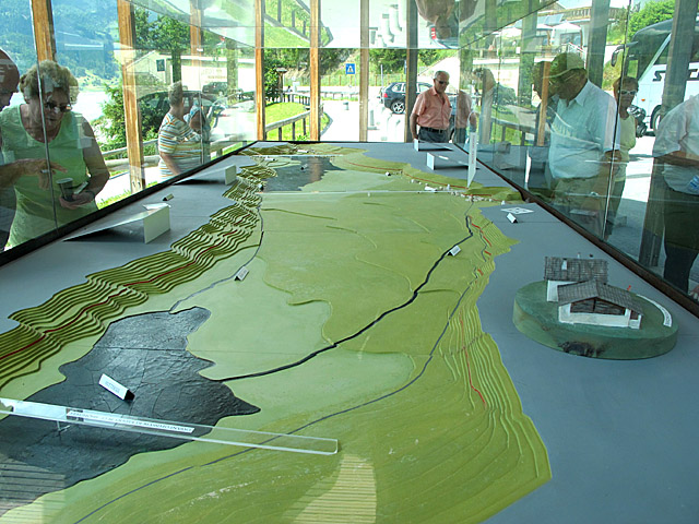 In Sichtweite zum Kirchturm befindet sich eine Vitrine, in der einiges an Informatinsmaterial aushängt. Prunkstück von allem ist ein Modell des Sees, wie er vor und nach der Flutung aussah/aussieht.