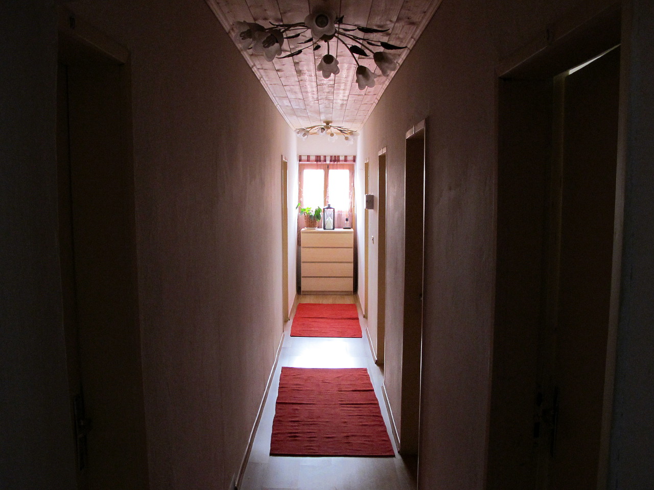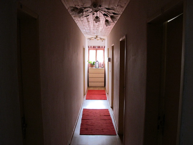 Der Gang im 1. Stock ist eher der schmalen Art. Die Türen links und rechts beherbergen die kleinen Zimmer.