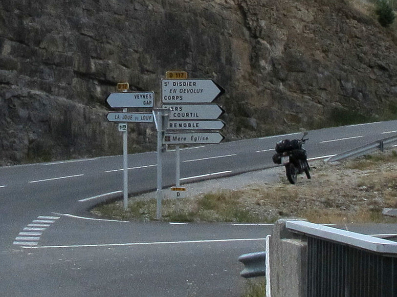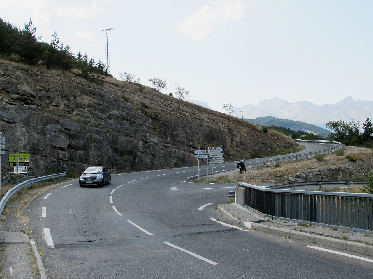 Die Kreuzung liegt zwischen dem in Fahrtrichtung befindlichen Col de Rioupes, wohingegen der gemütlichere Col du Noyer im Rücken des Betrachters zu finden ist. Rechs geht es nach Norden und hinein in ein kurviges und grünes Tal.