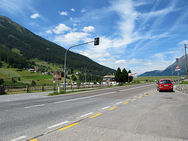 Die quer durchs Bild verlaufende Hauptstraße ist die Südrampe des Reschenpass, die rechts nach Norden und zur Passhöhe führt. Auf dem kleinen Weg links geht es ins Rojental, eine schmale Nebenstraße die westlich des Sees nach Norden führt. Aufgenommen wurde das Bild von einer Bushaltestelle, die als Referenzpunkt für die Einfahrt-Suche dienen kann. Über und links des roten Autos ist die Staumauer des Reschensee zu erkennen.