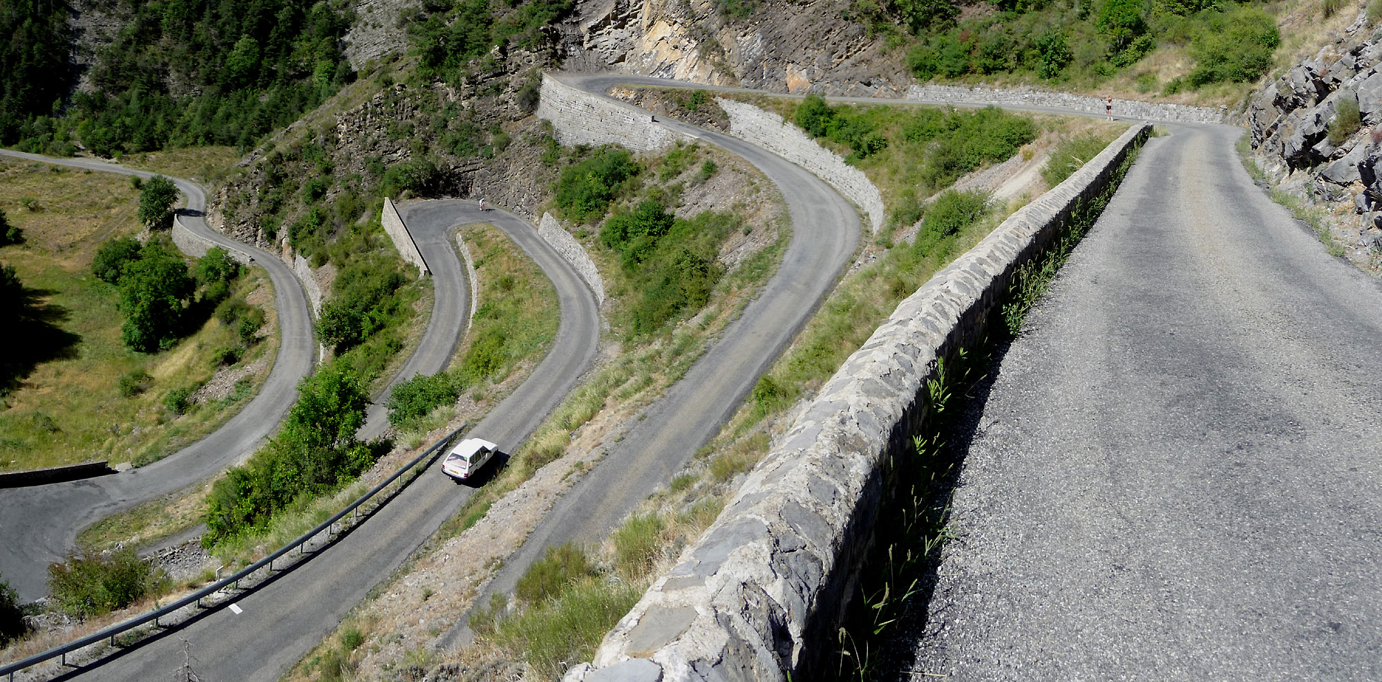 Südlich der Passhöhe geht es auf einem kurzen Teilstück steil den Berg hinunter. Abgesehen davon gibt es ansonsten am Sagnes kaum Kehren.