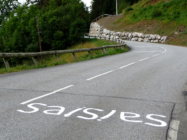 Die komplette Südseite ist mit Saisies-Schriftzügen zugepinselt. 2009 führte die Tour de France über diesen Pass, somit kann man sie als Werbung in eigener Sache sehen.