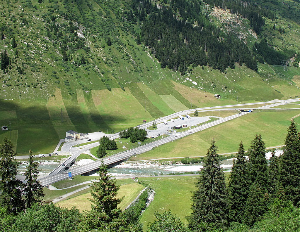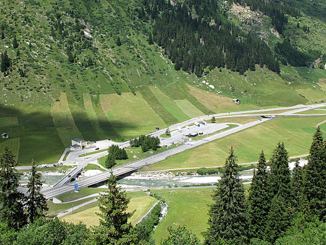 Blick aus dem kehrenlastigen Bereich hinunter ins Tal. Die vom Gebäude auf der linken Seite nach oben rechts aus dem Bild hinausführende Straße (die obere von den beiden) ist die vignettenfreie, der breite Strich in der Bildmitte die durch den Tunnel führende Autobahn. Zum Pass geht es über die kleine Brücke, auf der sich gerade ein dunkelblaues Auto befand. Wer vom Bernardino kommend auf die vignettenfreie Straße gelagen will, muss gleich hinter der Brücke links zum Gebäude abbiegen, ansonsten landet man auf der Autobahn.