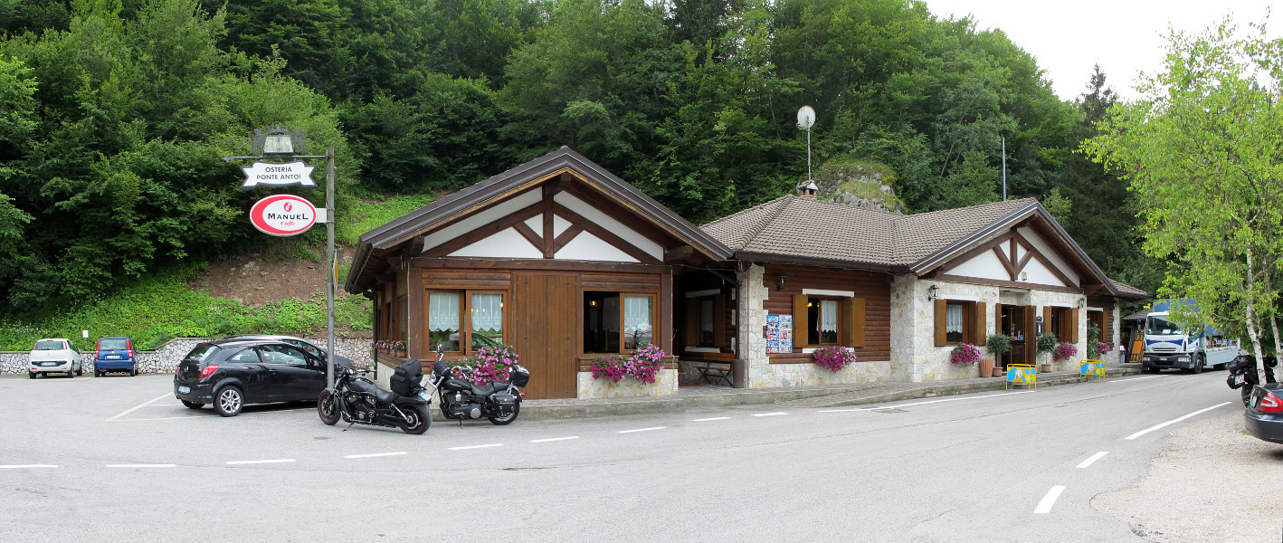 Hauptgebäude und Terrasse der Osteria Ponte Antoi werden von einer Straße getrennt,
