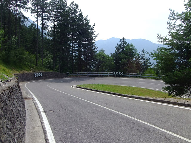 Eine der nett zu fahrenden Kehren, die auf sehr gutem Asphalt gefahren werden können und die Westrampe zu einem kurzweiligen Vergnügen machen.