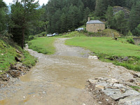 Oberhalb der Passhöhe des Coll de la Basseta(i), direkt am gut besuchten Refugio, zweigt ein gleich bergab führender Wanderweg ab. Wenigstens ist er auf Michelin-Karten als Wanderweg eingezeichnet, Google-Maps kennt ihn gar nicht. Wie auch immer, die erste Hälfte gehe es auf einer Spur den Berg hinab, die Piste besteht aus Steinen und Erde. Ungefähr zur Hälfte landet man im Tal, die Fahrt geht dann nur noch am Fluß Riu de Santa Magdalena entlang, der an zwei Stellen durchquert werden möchte. Die erste Stelle geht noch, ist breit und fließt langsam, die zweite (kurz vor Erreichen der Kapelle St. Magdalena) dagegen hat mitunter starke Strömung zu verzeichnen. Stark genug, um mich Wasserdurchfahrtneuling bei regnerischem Wetter zum Umkehren zu zwingen, das war mir doch etwas wackelig.